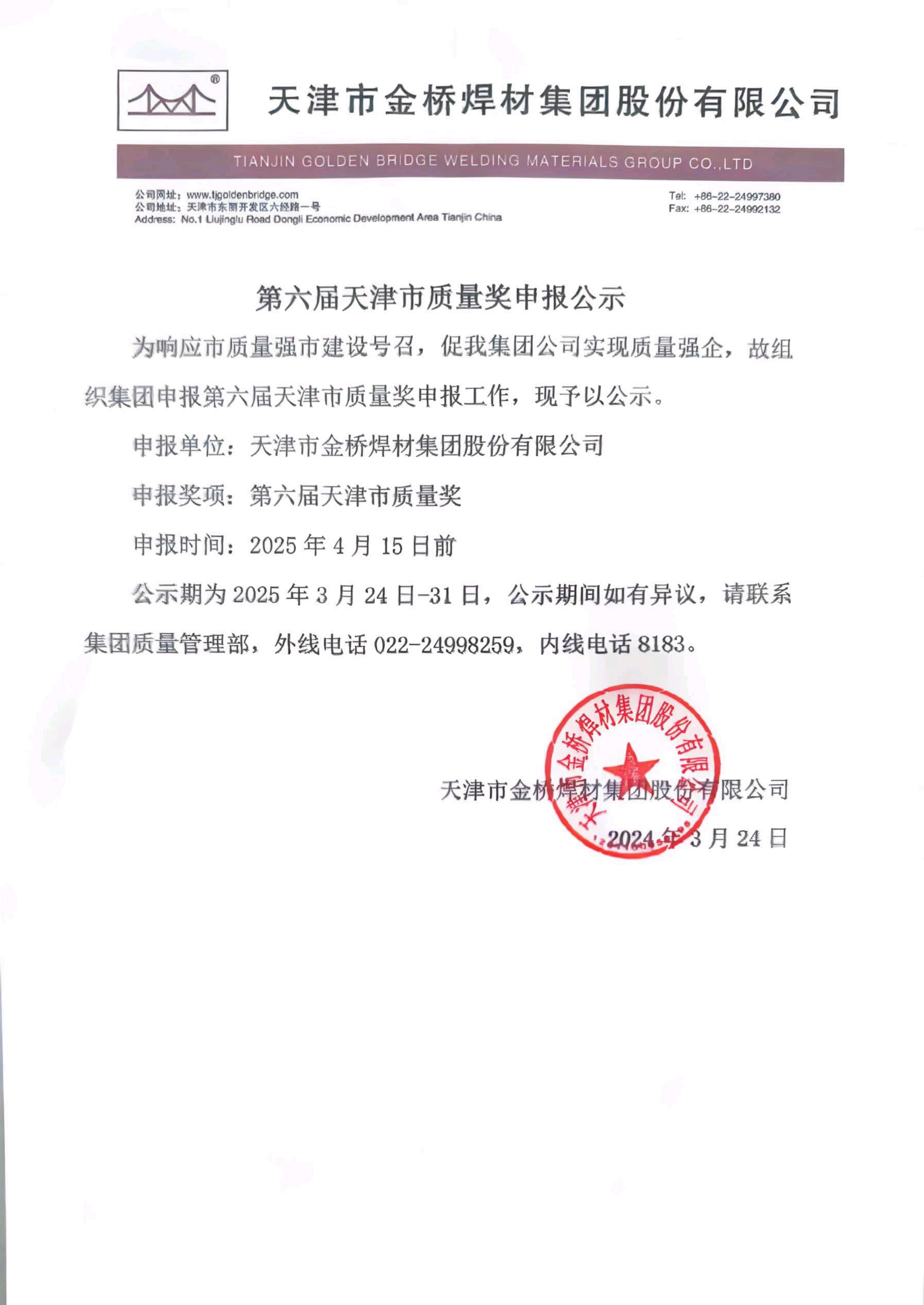 为响应市质量强市建设号召,促我集团公司实现质量强企,故组织集团申报第六届天津市质量奖申报工作,现予以公示。