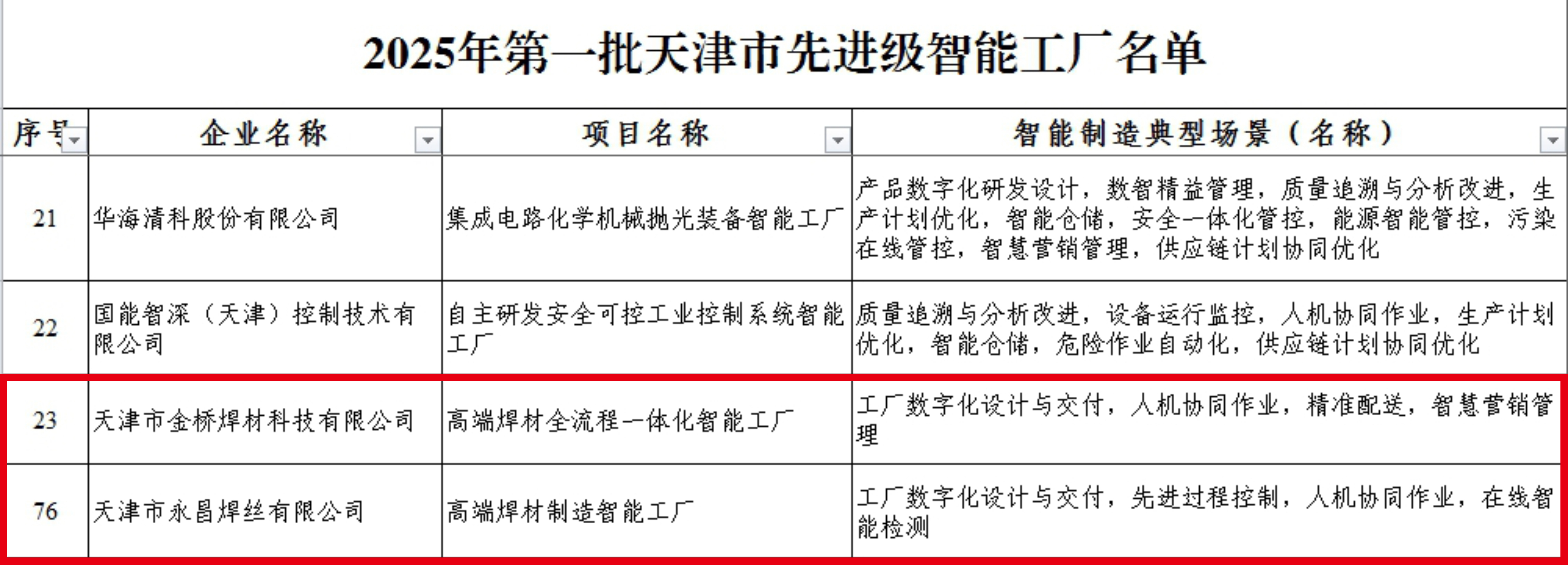 金桥科技公司、永昌焊丝双双斩获天津市首批“先进级智能工厂”认证